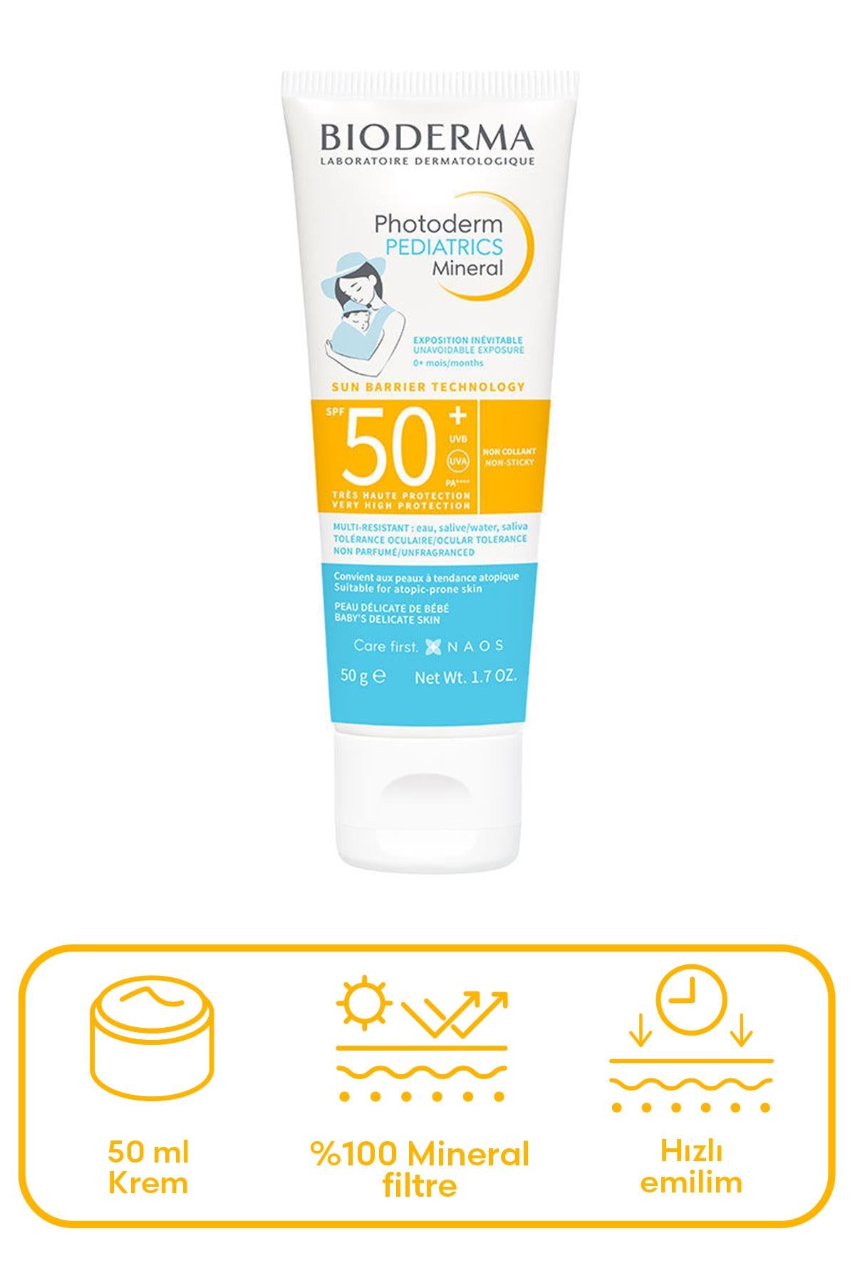 Bioderma Photoderm Pediatrics Mineral SPF50+ 50 gr, çocukların ve bebeklerin hassas cildi için özel olarak geliştirilmiş, UVB ile uzun ve kısa UVA ışınlarına karşı geniş spektrumlu bir koruma sunar. Sun Barrier Teknolojisi sayesinde cildin bariyer fonksiyonunu destekleyebilir ve güçlendirebilir.