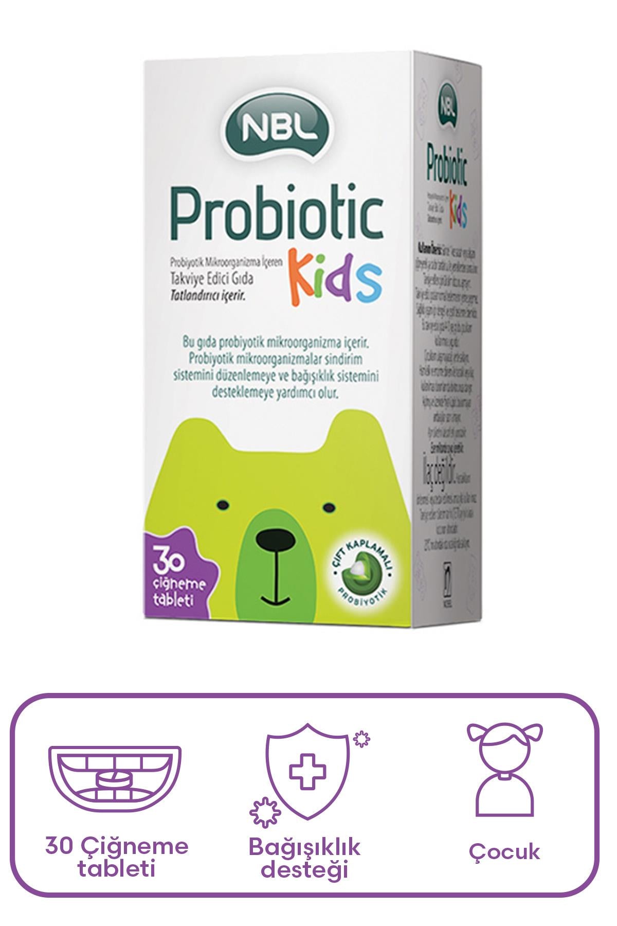 Nbl Probiyotik Kids 30 Tablet, çocukların sindirim ve bağışıklık sistemlerini desteklemek amacıyla özel olarak formüle edilmiş bir takviye edici gıdadır.